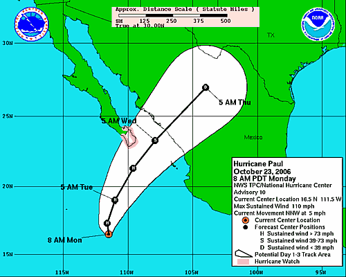 The current projected path will bring Hurricane Paul near Los Cabos sometime Tuesday afternoon or Wednesday morning. It looks like Paul could miss the Los Cabos area with its full force, but could still bring high winds and heavy rains. Hurricane precautions and tropical storm preparations should be underway.
