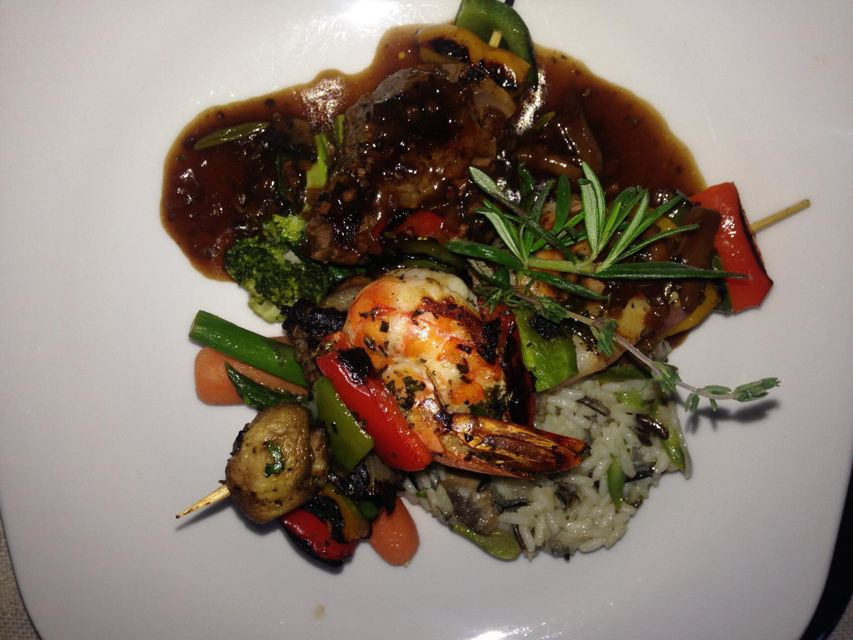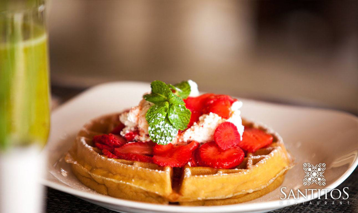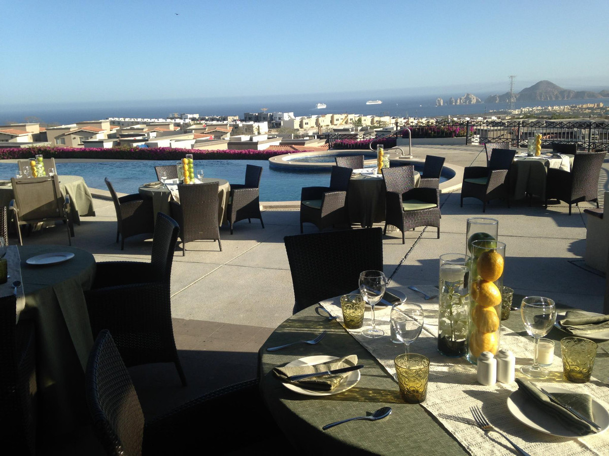 The residents of Ventanas Residenes are quite lucky to have a restaurant of the caliber of Santitos right on campus so they can dine on its beautiful terrace or enjoy a meal prepared by the chef and delivered to their home. Of course, you don’t have to live at Ventanas to take advantage of what this restaurant has to offer. Open for breakfast, lunch, and dinner, Santitos boasts such items as Belgium waffles with Chantilly cream for breakfast or Sunday brunch. There are also wood-fired pizzas or Kami-Kami sushi for lunch, as well as a wide dinner selection. On this particular evening, chef Marco Magaña prepared surf and turf brochette with jumbo shrimp and filet mignon on a bed of fresh roasted tomatoes, peppers, mushrooms, and potatoes. Santitos specializes in a combination of Italian, Mediterranean, and Japanese (think sushi) cuisine. The ideal time to dine is when the sun is setting and the view is spectacular; look out over the blue waters of the Pacific Ocean and Sea of Cortés with a view of Land’s End. The sea breezes will keep you cool and comfortable on the expansive terrace, or you can sit indoors in the air-conditioned comfor